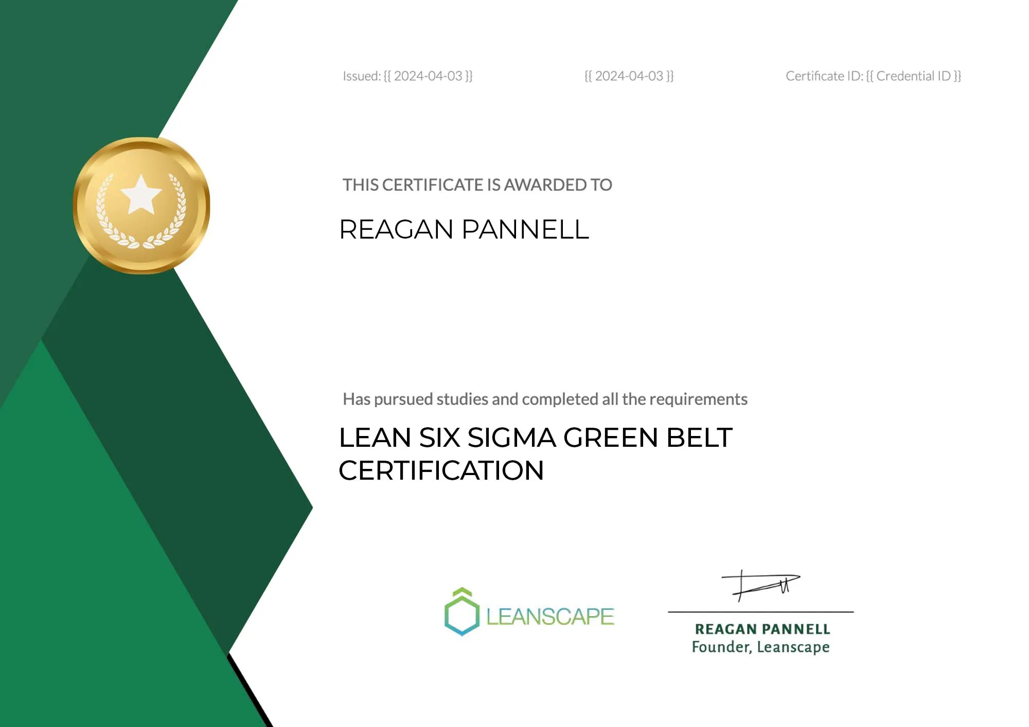 Once all completed, reveive your Leanscape Lean Six SIgma Green Belt Certificate.